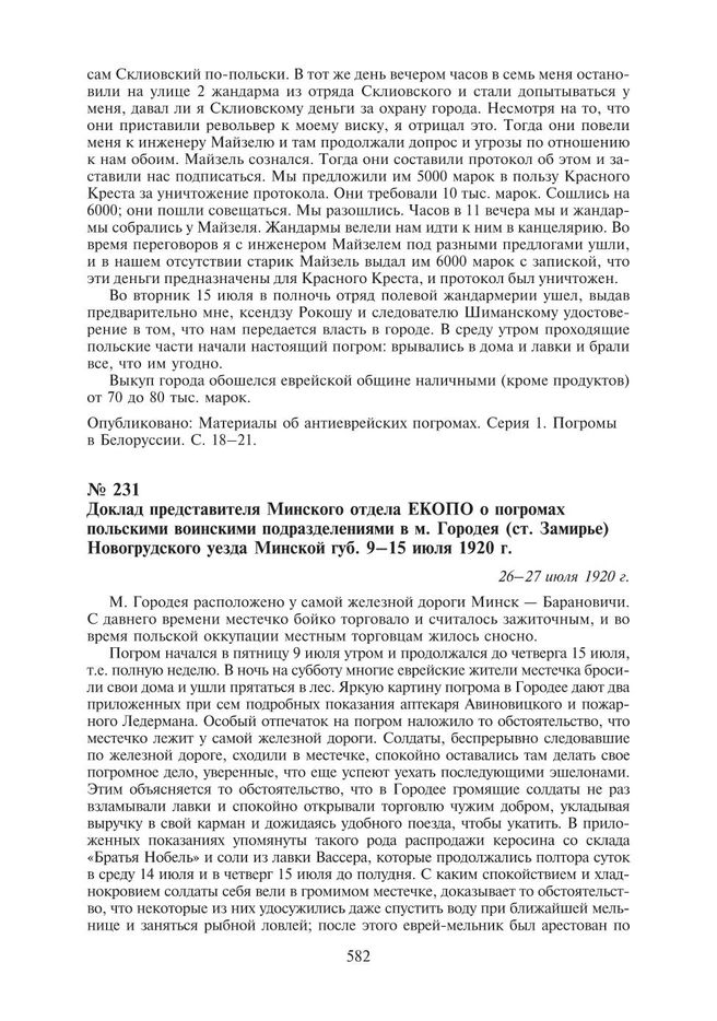 Доклад представителя Минского отдела ЕКОПО о погромах польскими воинскими подразделениями в м. Городея (ст. Замирье) Новогрудского уезда Минской губ. 9–15 июля 1920 г. 26–27 июля 1920 г.