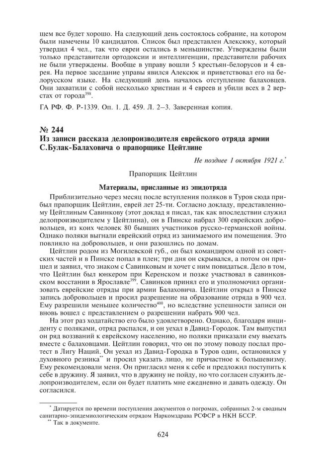 Из записи рассказа делопроизводителя еврейского отряда армии С.Булак-Балаховича о прапорщике Цейтлине. Не позднее 1 октября 1921 г. // ГА РФ. Ф. Р-1339. Оп. 1. Д. 461. Л. 36. Копия.