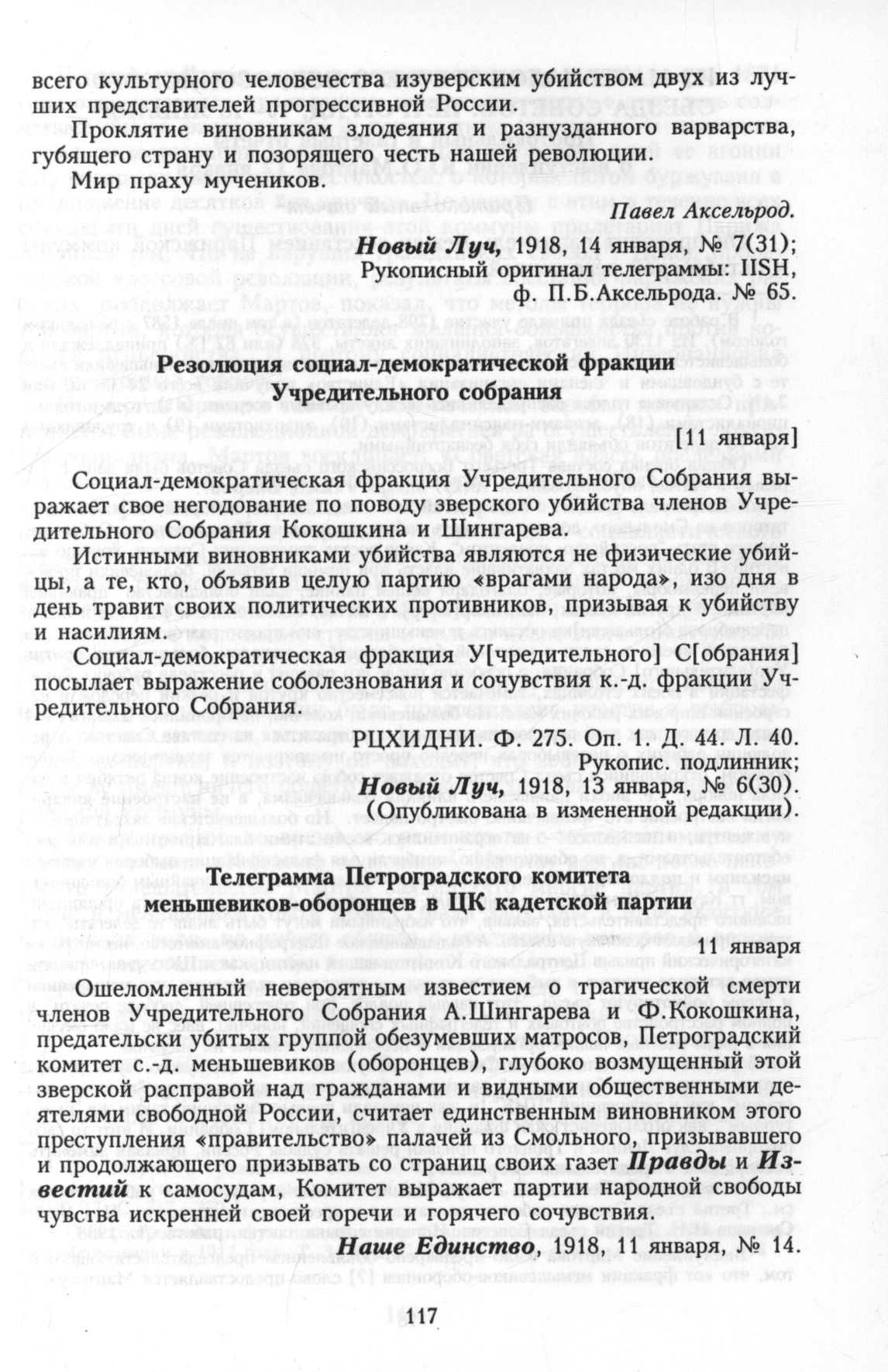 Главная Серия «Политические партии России. Конец XIX – первая треть ХХ века... Меньшевики в 1903—1931 гг. Меньшевики в большевистской России. 1918—1924. Меньшевики в 1918 году Документы Резолюции и телеграммы соболезнования по поводу убийства А.И.Шингар...