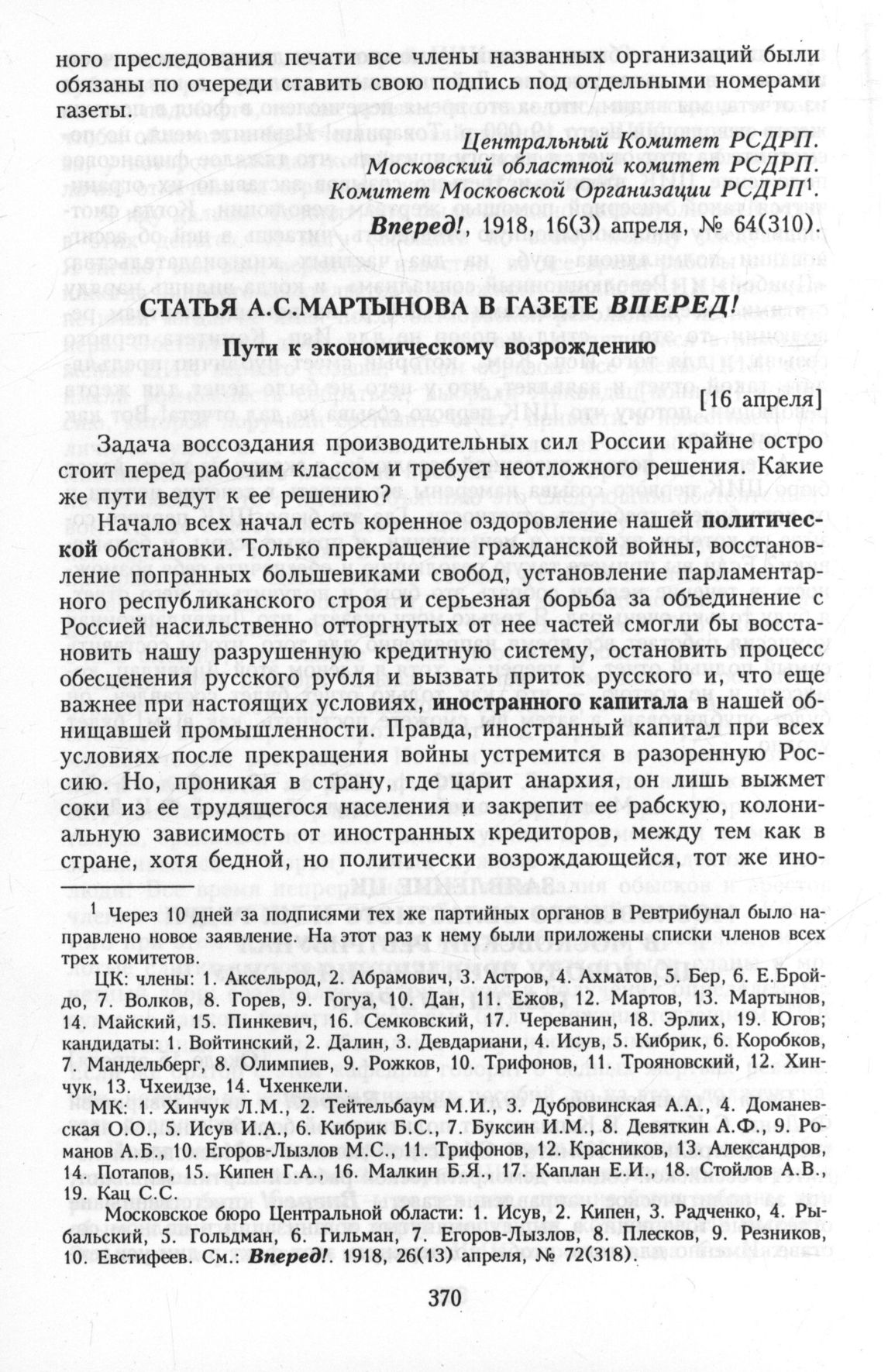 Главная Серия «Политические партии России. Конец XIX – первая треть ХХ века... Меньшевики в 1903—1931 гг. Меньшевики в большевистской России. 1918—1924. Меньшевики в 1918 году Документы Статья А.С.Мартынова в газете Вперед! Пути к экономическому возрожд...