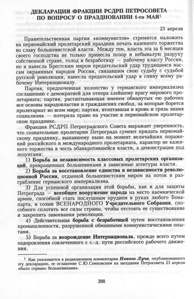 Главная Серия «Политические партии России. Конец XIX – первая треть ХХ века... Меньшевики в 1903—1931 гг. Меньшевики в большевистской России. 1918—1924. Меньшевики в 1918 году Документы Декларация фракции РСДРП Петросовета по вопросу о праздновании 1-го...