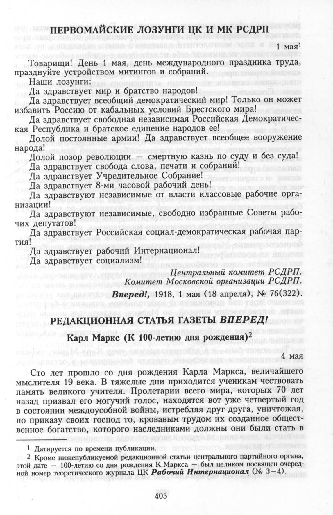 Первомайские лозунги ЦК и МК РСДРП. 1 мая // Вперед!, 1918, 1 мая (18 апреля), № 76(322).