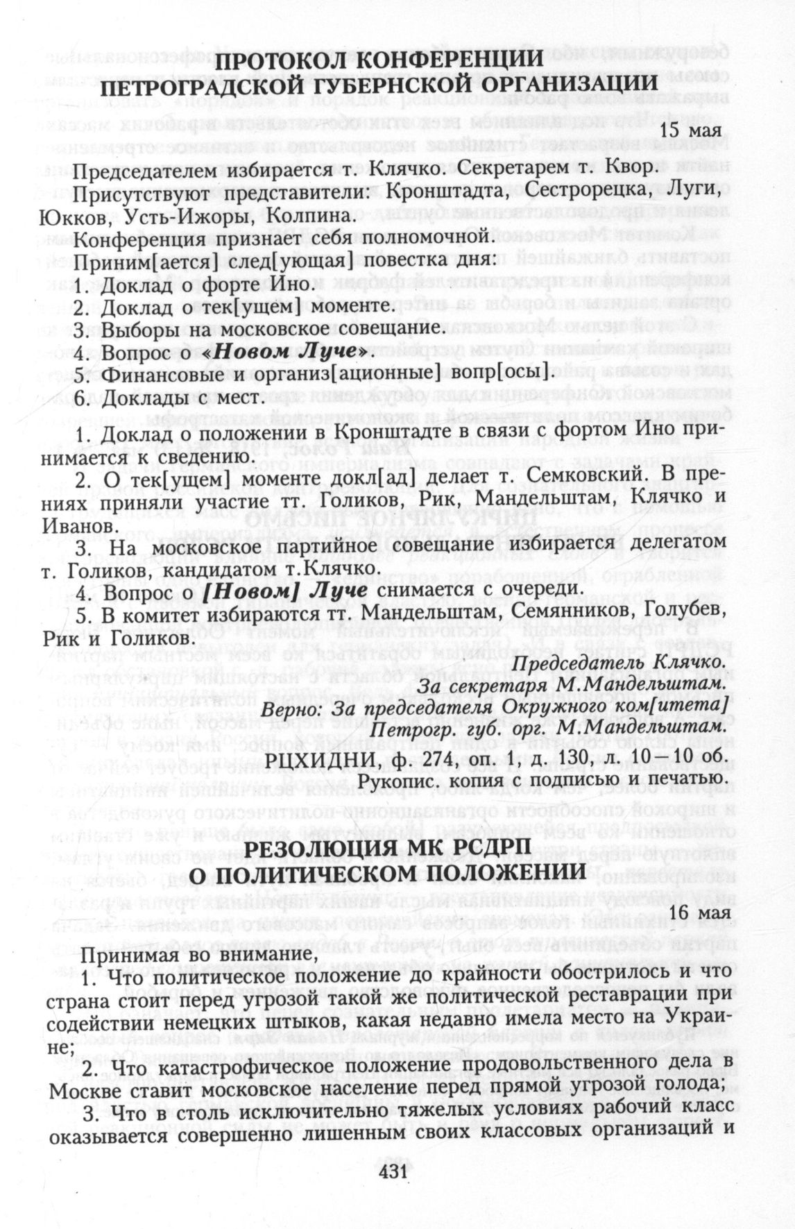 Главная Серия «Политические партии России. Конец XIX – первая треть ХХ века... Меньшевики в 1903—1931 гг. Меньшевики в большевистской России. 1918—1924. Меньшевики в 1918 году Документы Протокол конференции Петроградской губернской организации. 15 мая