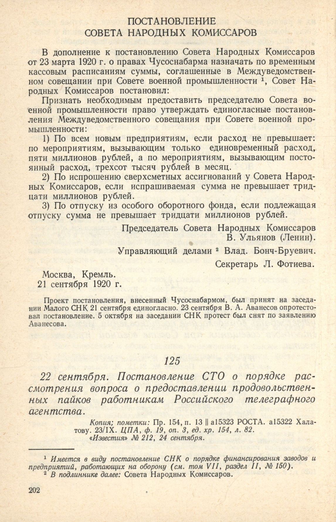 22 сентября. Постановление СТО о порядке рассмотрения вопроса о предоставлении продовольственных пайков работникам Российского телеграфного агентства // Копия; пометки: Пр. 154, п. 13 а15323 РОСТА. а15322 Халатову. 23/IX. ЦПА, ф. 19, оп. 3, ед. хр. 154, л. 82. «Известия» № 212, 24 сентября.