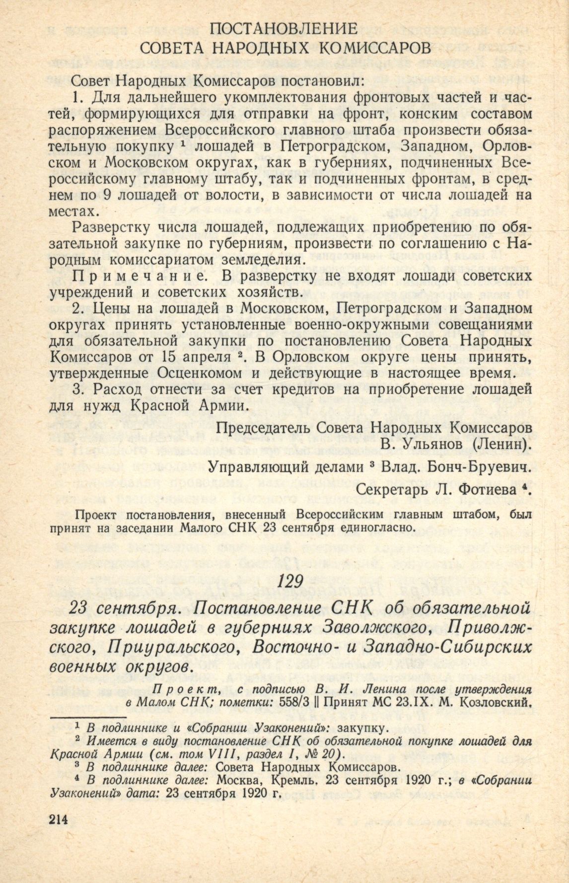 23 сентября. Постановление СНК об обязательной закупке лошадей в губерниях Заволжского, Приволжского, Приуральского, Восточно- и Западно-Сибирских военных округов // Проект, с подписью В. И. Ленина после утверждения в Малом СНК; пометки: 558/3 Принят МС 23.IX. М. Козловский. Ф. Сыромолотов. А. Якубов. А. Аникст. А. Галкин. Чуцкаев Наркомюст Курский Докладчик Лезгинцев. Щербаков (ВГШ). ЦПА, ф. 2, оп. 1, ед. хр. 15498, л. 2. Постановление: Подлинник; пометка: Пр. № 558, п. 3. ЦПА, там же, л. 1. «Известия» №215, 28 сентября; «Собрание Узаконений» №81, ст. 390.