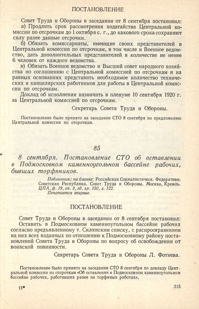 8 сентября. Постановление СТО об оставлении в Подмосковном каменноугольном бассейне рабочих, бывших торфяников // Подлинник; на бланке: Российская Социалистическ. Федеративн. Советская Республика. Совет Труда и Обороны. Москва, Кремль. ЦПА. ф. 19, оп. 3, ед. хр. 150, л. 122. Печатается впервые.