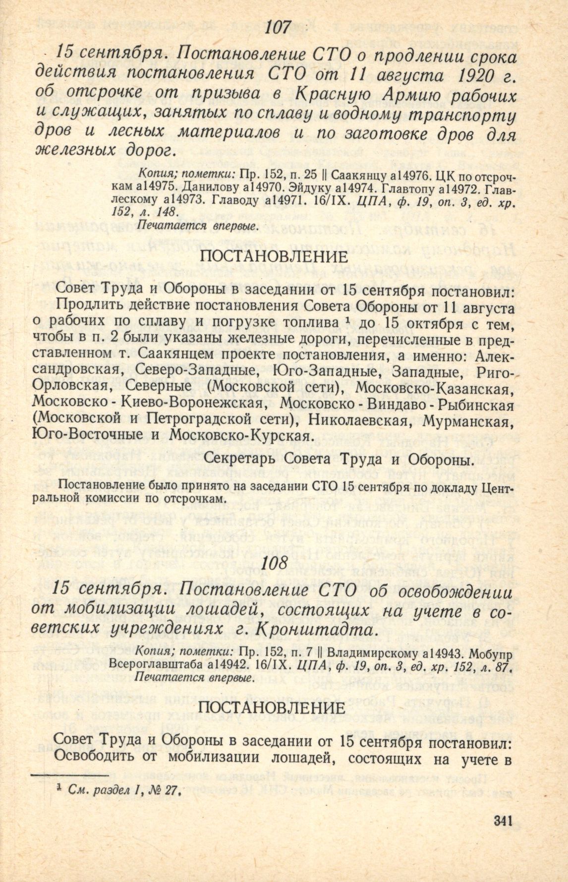15 сентября. Постановление СТО об освобождении от мобилизации лошадей, состоящих на учете в советских учреждениях г. Кронштадта // Копия; пометки: Пр. 152, п. 7 || Владимирскому а14943. Мобупр Всероглавштаба а14942. 16/IХ. ЦПА, ф. 19, оп. 3, ед. хр. 152, л. 87. Печатается впервые.