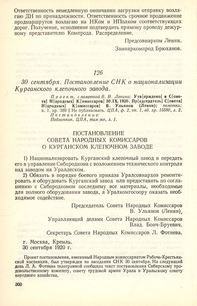 30 сентября. Постановление СНК, о национализации Курганского клепочного завода // Проект, с пометкой В. И. Ленина: Утверждено в Совете Народкых Комиссаров 30.IX. 1920. Председатель Совета Неродных Комиссаров В. Ульянов (Ленин); пометки: п. 1, пр. 389 || Не публиковать. ЦПА, ф. 2, оп. 1, ед. хр. 15580, л. 2. Постановление: Подлинник. ЦПА, там же, л. 1.