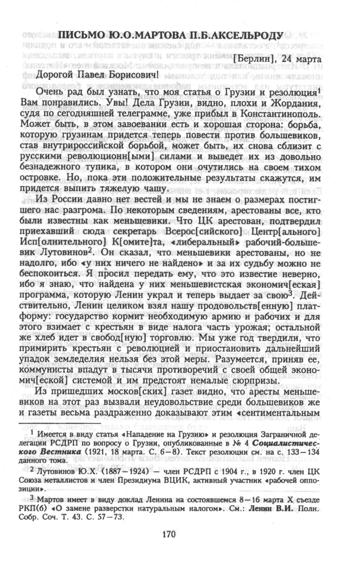 Письмо Ю.О. Мартова П.Б. Аксельроду [Берлин]. 24 марта // IISH. Ф. П.Б. Аксельрода, переписка, № 30. Без нумерации листов. Автограф; Hoover Institution Archives, Boris I. Nikolaevsky Collection. Series 279. Box 660. Folder 5. Машинописная копия; Ю.О. Мартов, Письма. С. 111 — 113.