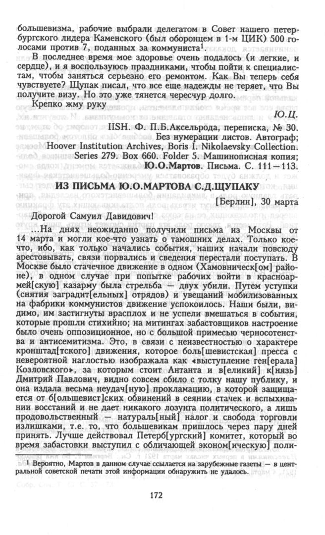 Из письма Ю.О. Мартова С.Д. Щупаку [Берлин]. 30 марта // Hoover Institution Archives, Boris I. Nikolaevsky Collection. Series 21. Box 60. Folder 2. Автограф. Чернила; Там же. Series 16. Box 44. Folder 21. Машинописная копия.