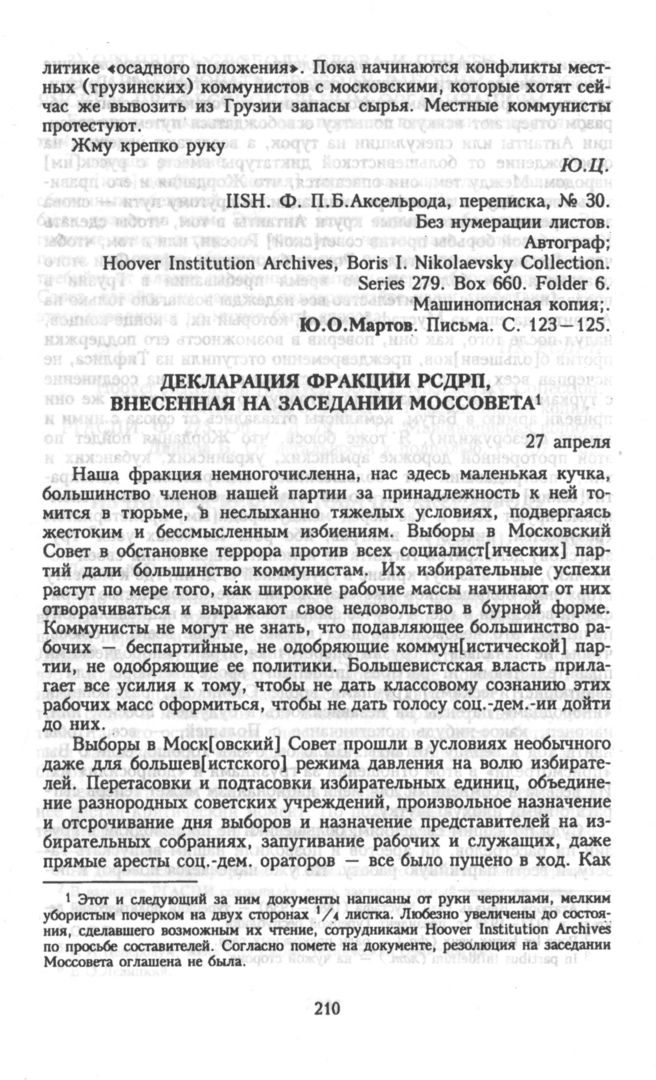 Декларация фракции РСДРП, внесенная на заседании Моссовета. 27 апреля // Hoover Institution Archives, Boris I. Nikolaevsky Collection. Series 6. Box 5. Folder 25. Рукописный оригинал.