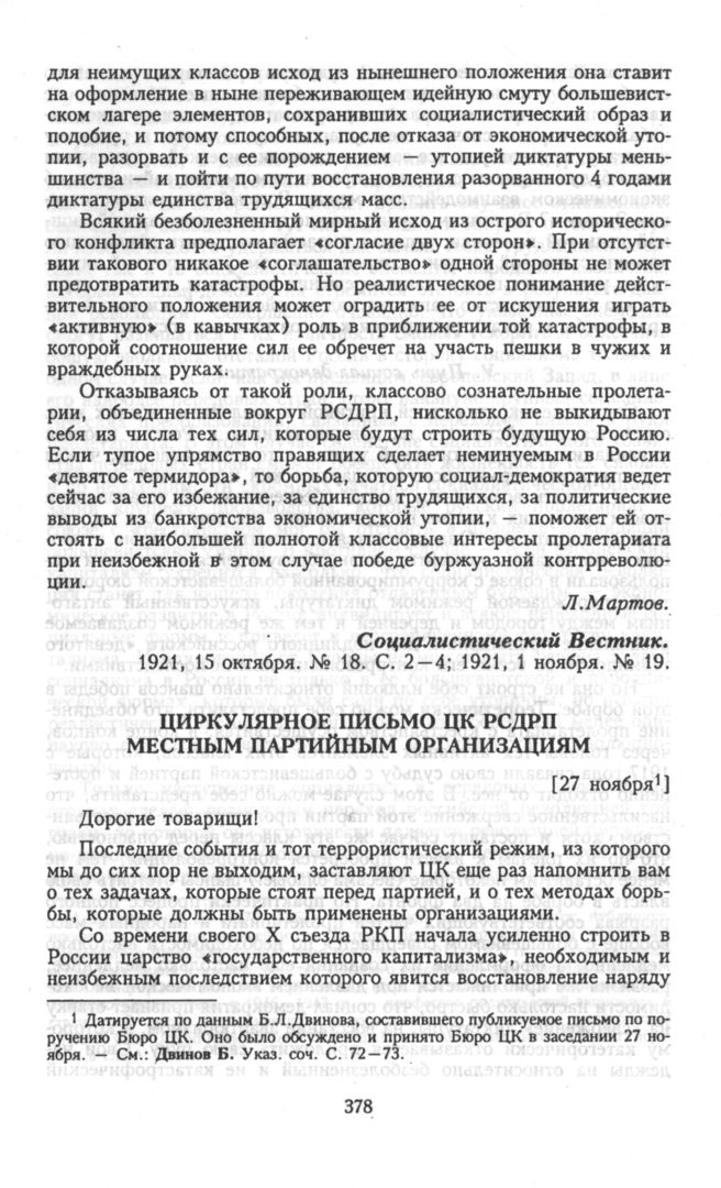 Главная Серия «Политические партии России. Конец XIX – первая треть ХХ века... Меньшевики в 1903—1931 гг. Меньшевики в большевистской России. 1918—1924. Меньшевики в 1921—19... Документы Циркулярное письмо ЦК РСДРП местным партийным организациям. [27 ноя...