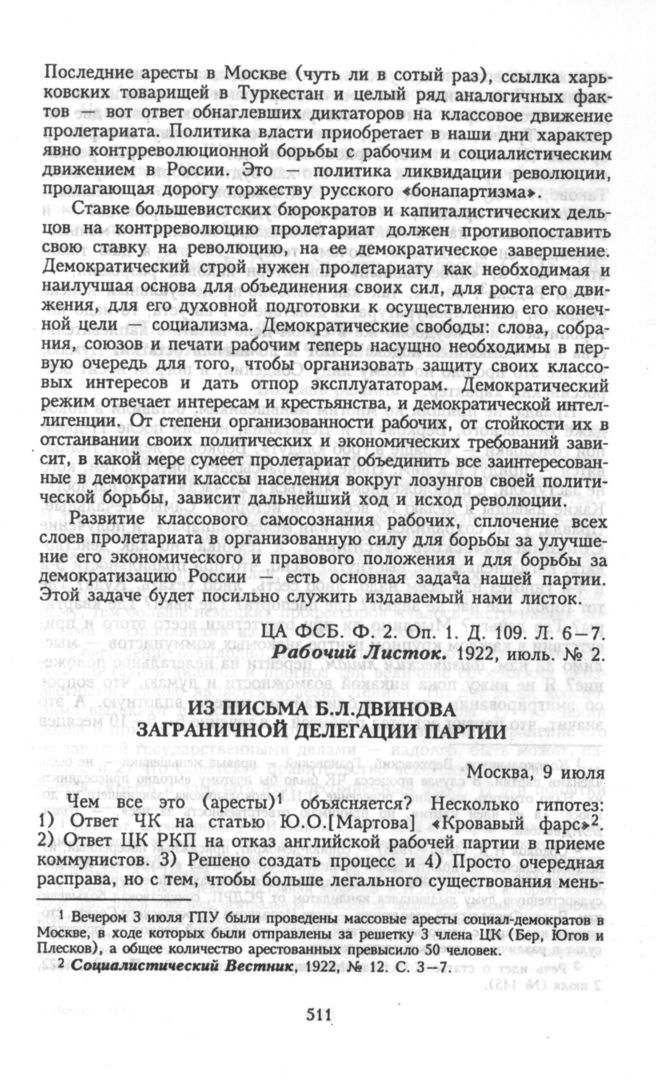 Из письма Б. Л. Двинова Заграничной делегации партии. Москва, 9 июля // Двинов Б. От легальности к подполью. С. 145 — 146.