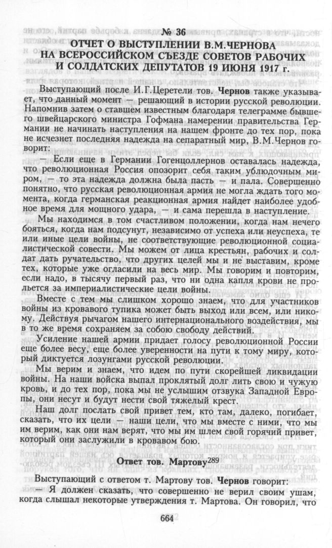 Отчет о выступлении В.М.Чернова на Всероссийском съезде Советов рабочих и солдатских депутатов 19 июня 1917 г.