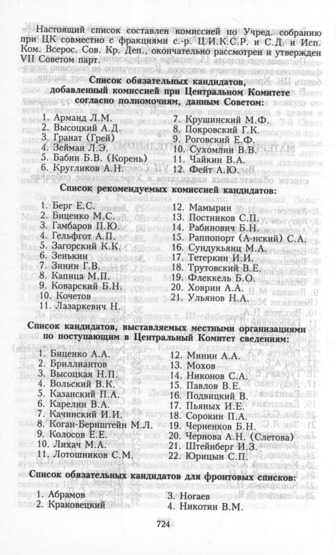 Материалы к Учредительному собранию: Список обязательных кандидатов для фронтовых списков // Партийные известия. 1917. № 2. Стб. 29 —34.