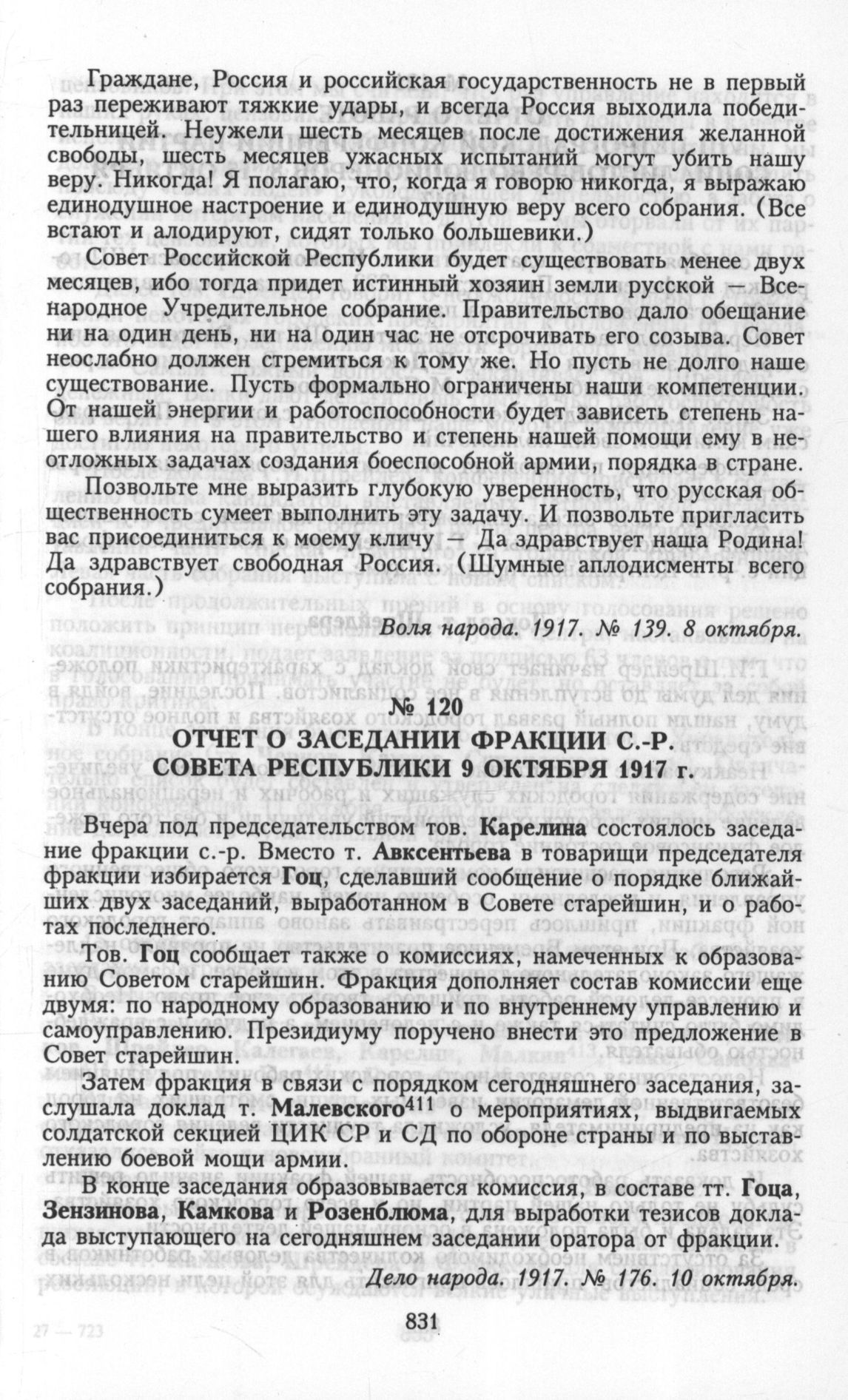 Отчет о заседании фракции с.-р. Совета Республики 9 октября 1917 г. // Дело народа. 1917. № 176. 10 октября.