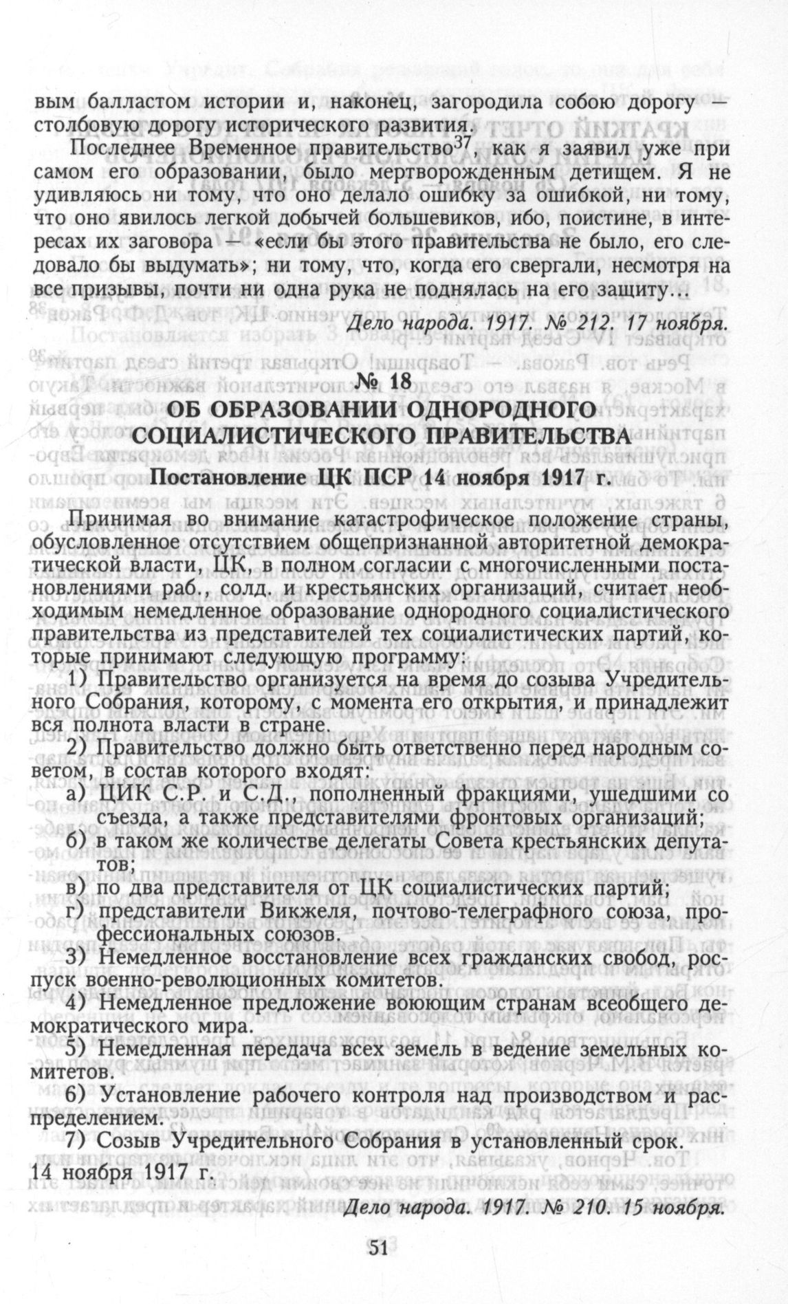Об образовании однородного социалистического правительства. Постановление ЦК ПСР 14 ноября 1917 г. // Дело народа. 1917. №210. 15 ноября.
