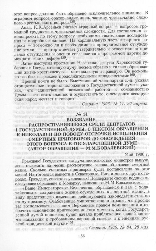 Воззвание, распространявшееся среди депутатов I Государственной думы, с текстом обращения к Николаю II по поводу отсрочки исполнения смертных приговоров до обсуждения этого вопроса в Государственной думе (автор обращения — М.М.Ковалевский). Май 1906 г. // Страна. 1906. № 84. 28 мая.