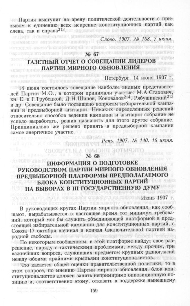 Информация о подготовке руководством Партии мирного обновления предвыборной платформы предполагаемого блока конституционных партий на выборах в III Государственную думу. Июнь 1907 г. // Слово. 1907. № 179. 21 июня.