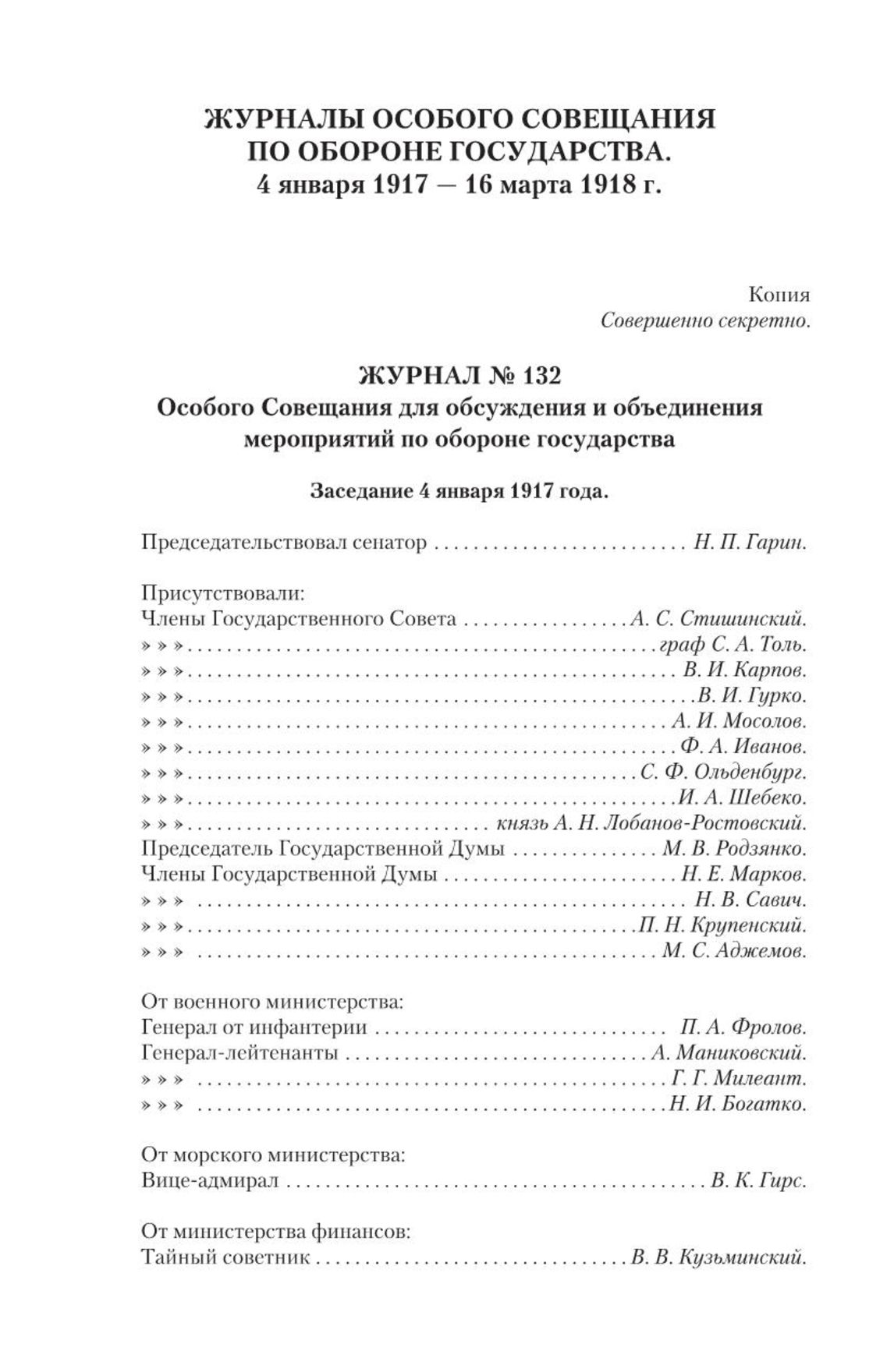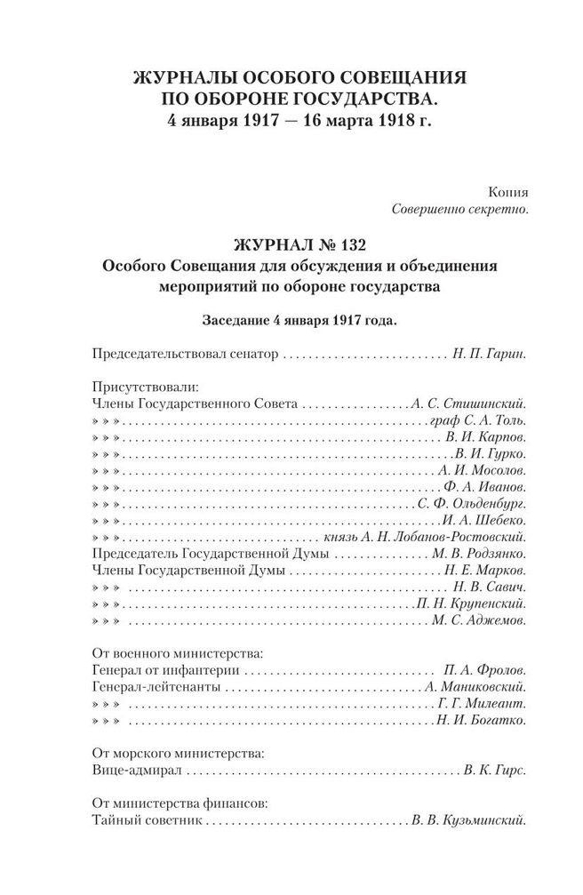 Журнал № 132 Особого Совещания для обсуждения и объединения мероприятий по обороне государства. Заседание 4 января 1917 г.