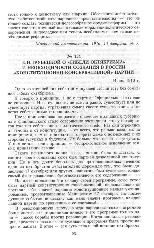 Е.Н.Трубецкой о «гибели октябризма» и необходимости создания в России «конституционно-консервативной» партии. Июнь 1910 г. // Московский еженедельник. 1910. № 25.