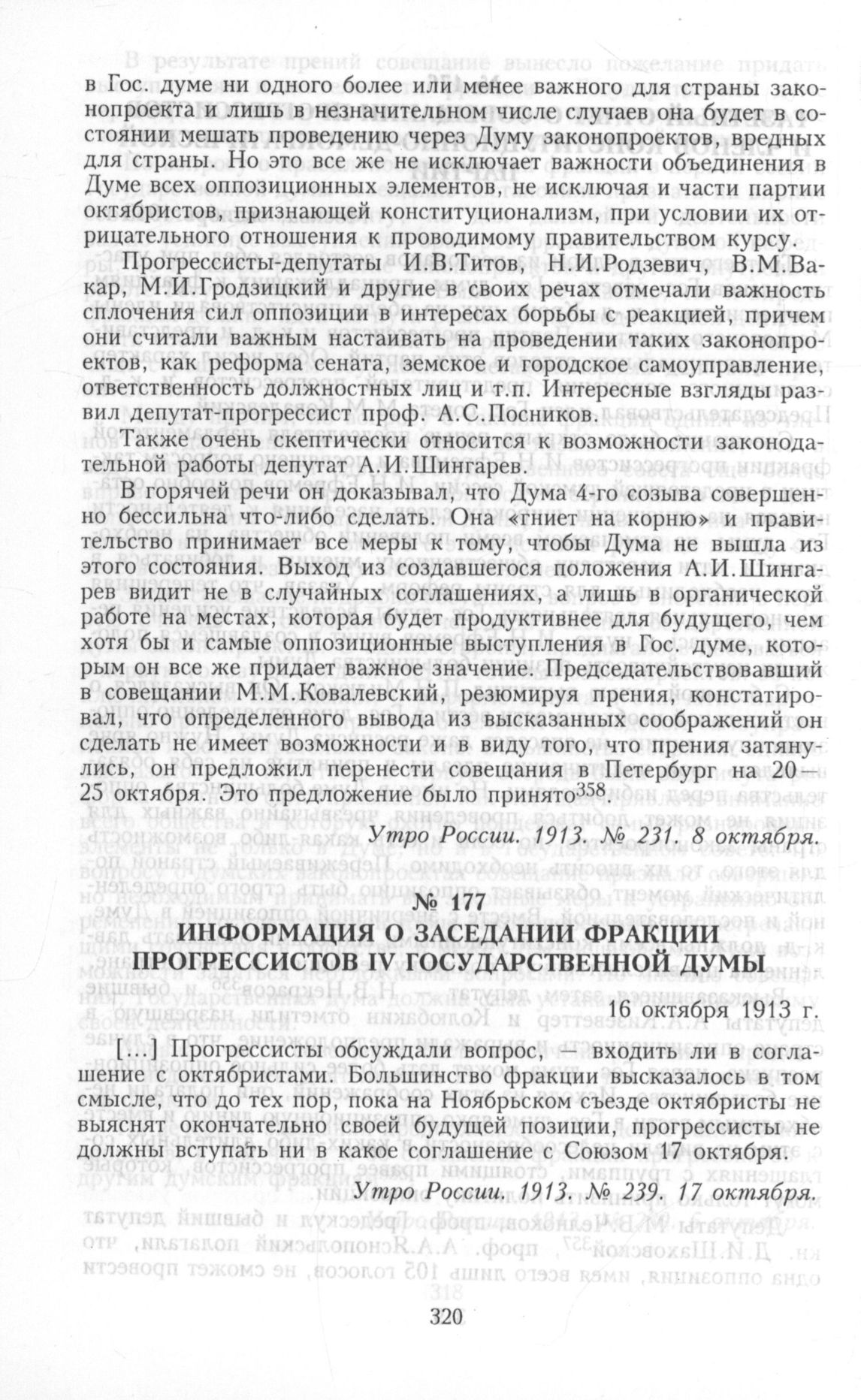 Информация о заседании фракции прогрессистов IV Государственной думы. 16 октября 1913 г. // Утро России. 1913. № 239. 17 октября.