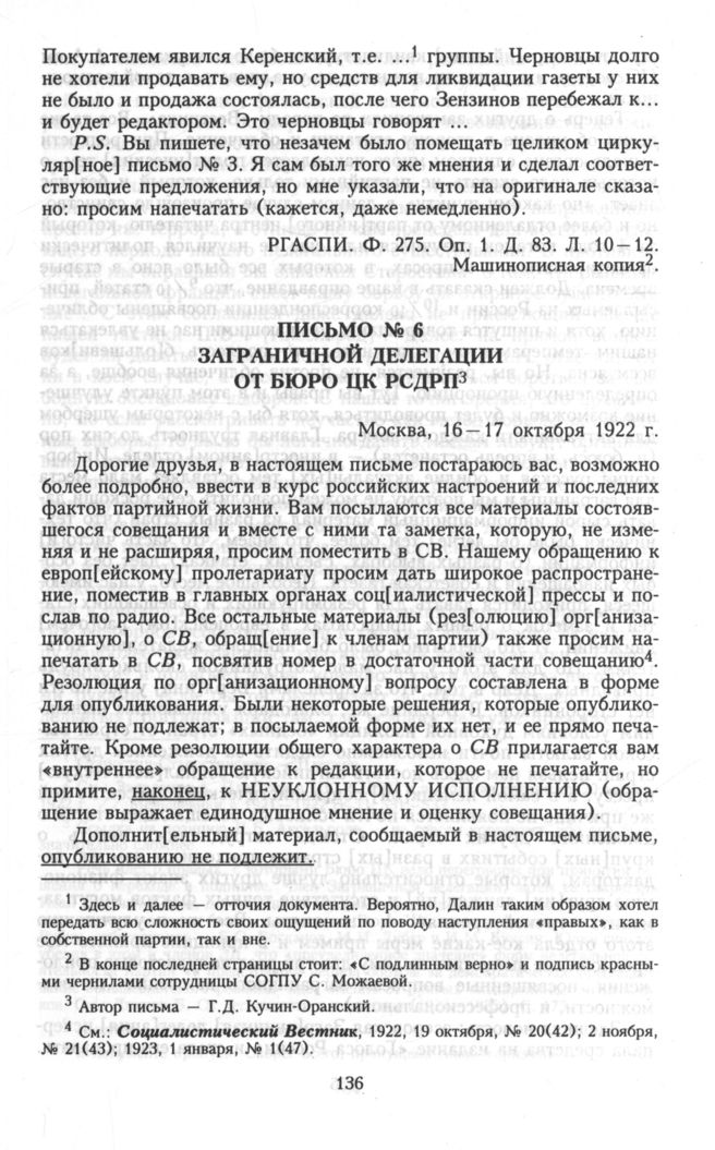 Главная Серия «Политические партии России. Конец XIX – первая треть ХХ века... Меньшевики в 1903—1931 гг. Меньшевики в большевистской России. 1918—1924. Меньшевики в 1922—19... Документы Письмо № 6 Заграничной делегации от Бюро ЦК РСДРП. Москва, 16 — 17 ...
