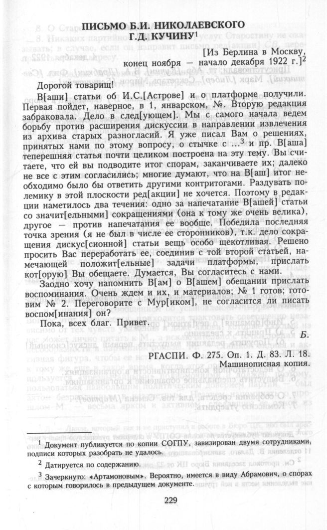 Письмо Б.И. Николаевского Г.Д. Кучину. [Из Берлина в Москву, конец ноября — начало декабря] // РГАСПИ, Ф. 275. Оп. 1. Д. 83. Л. 18. Машинописная копия.