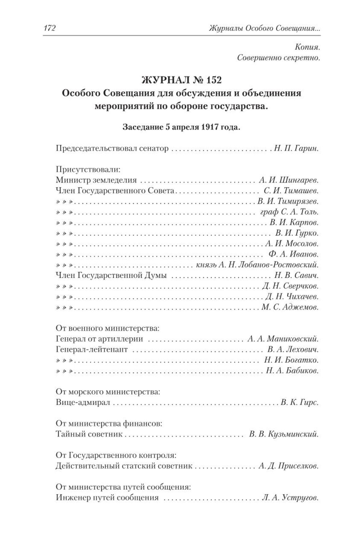 Журнал № 152 Особого Совещания для обсуждения и объединения мероприятий по обороне государства. Заседание 5 апреля 1917 г.