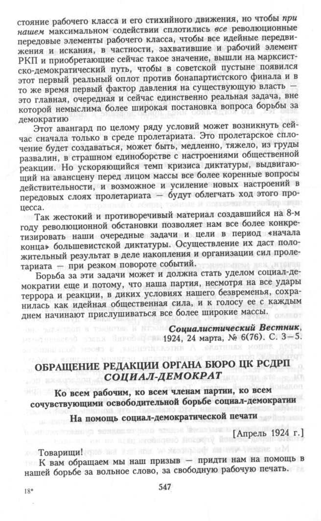 Главная Серия «Политические партии России. Конец XIX – первая треть ХХ века... Меньшевики в 1903—1931 гг. Меньшевики в большевистской России. 1918—1924. Меньшевики в 1922—19... Документы Обращение редакции органа Бюро ЦК РСДРП «Социал-Демократ». Ко всем ...