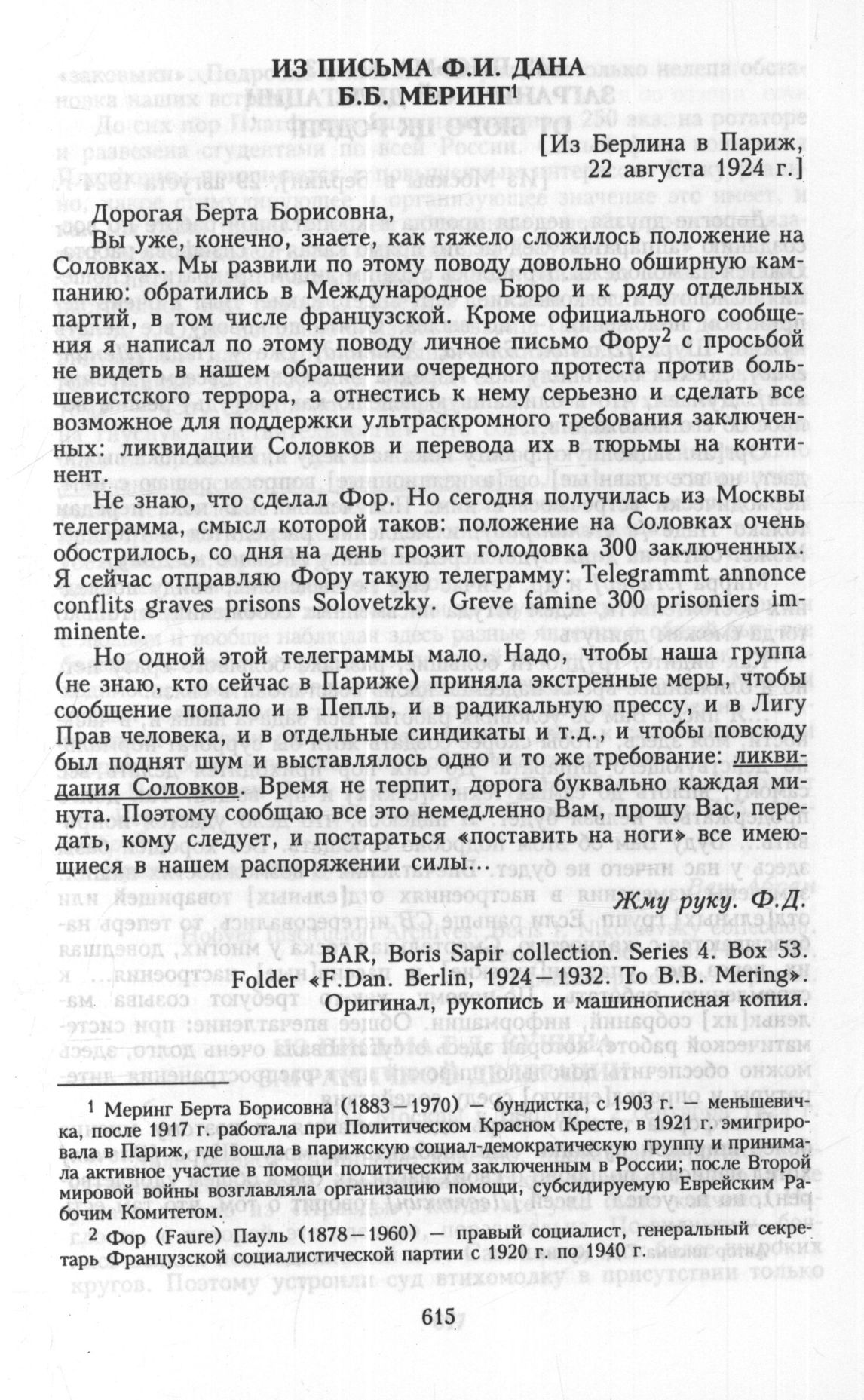 Главная Серия «Политические партии России. Конец XIX – первая треть ХХ века... Меньшевики в 1903—1931 гг. Меньшевики в большевистской России. 1918—1924. Меньшевики в 1922—19... Документы Из письма Ф.И. Дана Б.Б. Меринг. [Из Берлина в Париж. 22 августа]
