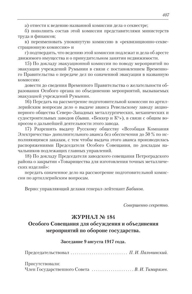 Журнал № 184 Особого Совещания для обсуждения и объединения мероприятий по обороне государства. Заседание 9 августа 1917 г.