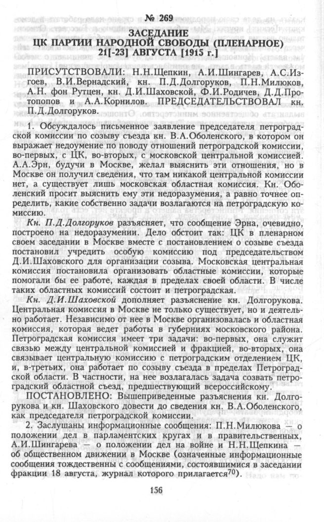 Протоколы Центрального Комитета конституционно-демократической партии. Заседание ЦК партии Народной Свободы (пленарное) 21[-23] августа [1915 г.]