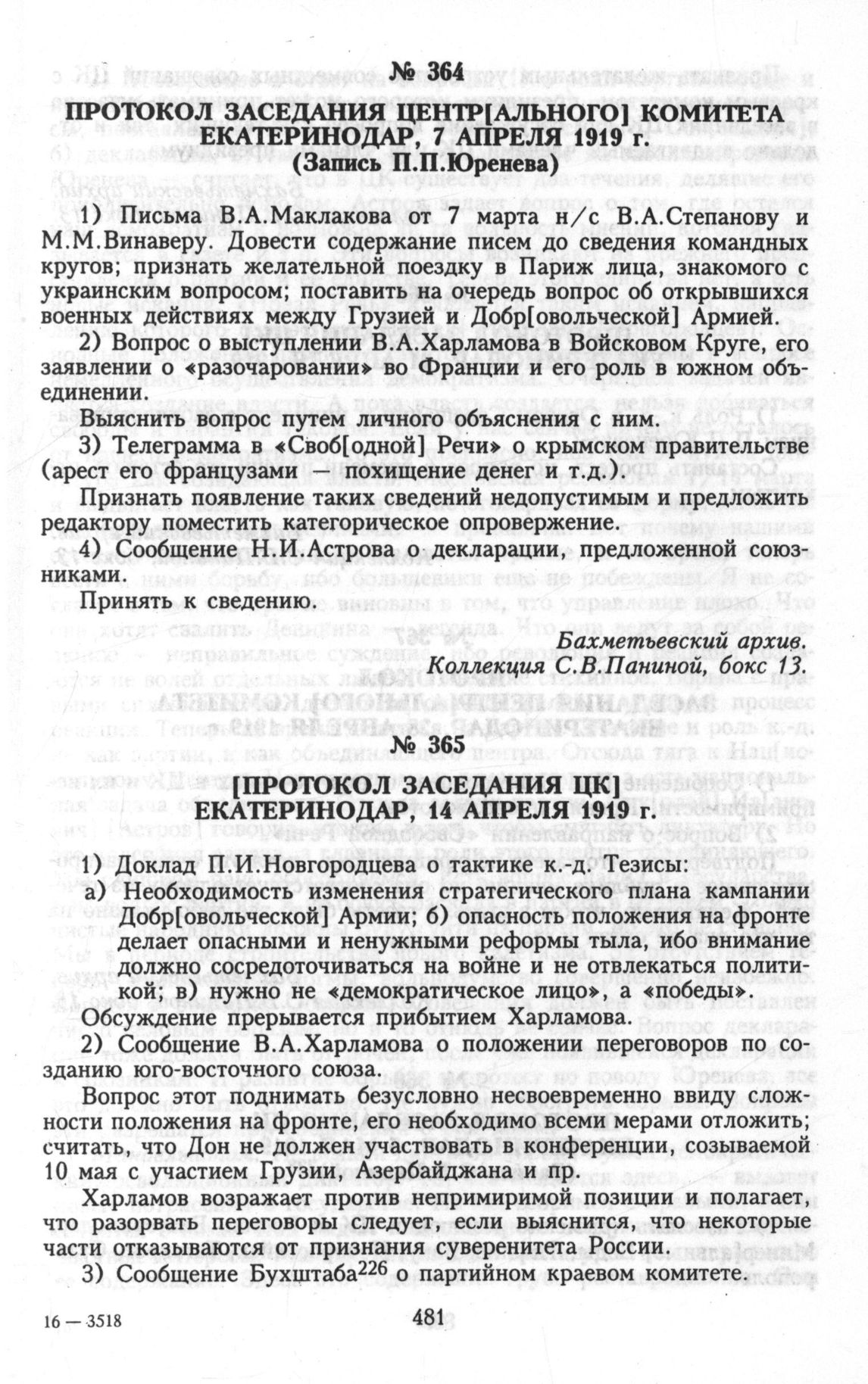 Протоколы Центрального Комитета конституционно-демократической партии. Протокол заседания Центр[ального] Комитета. Екатеринодар, 7 апреля 1919 г. (Запись П.П.Юренева)