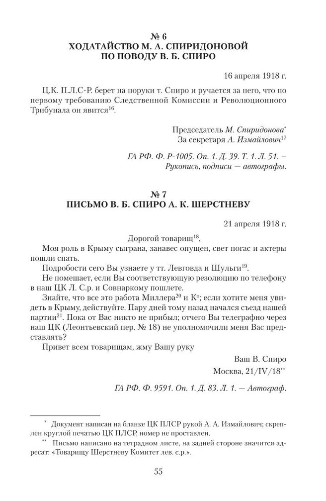 Партия левых социалистов-революционеров. Документы и материалы. 1917—1925 гг. В 3-х т. Т. 2. Ч. 1. Апрель—июль 1918 г. — М. : РОССПЭН, 2010.