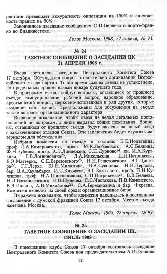 Газетное сообщение о заседании ЦК. Июль 1908 г. // Голос Москвы. 1908, 27 июля, № 174.
