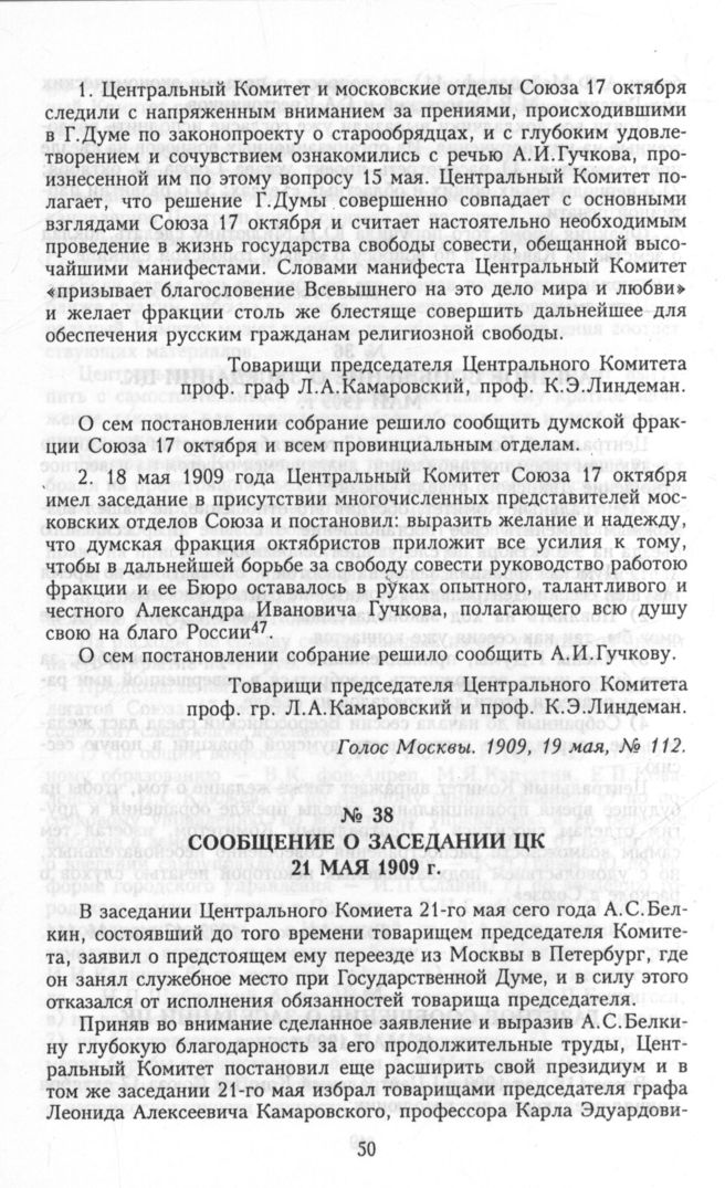 Главная Серия «Политические партии России. Конец XIX – первая треть ХХ века... Партия «Союз 17 октября». Протоколы съездов, конференций и заседани... Партия «Союз 17 октября». Протоколы съездов, конференций и заседани... Документы Сообщение о заседании ЦК 21 мая 1909 г.