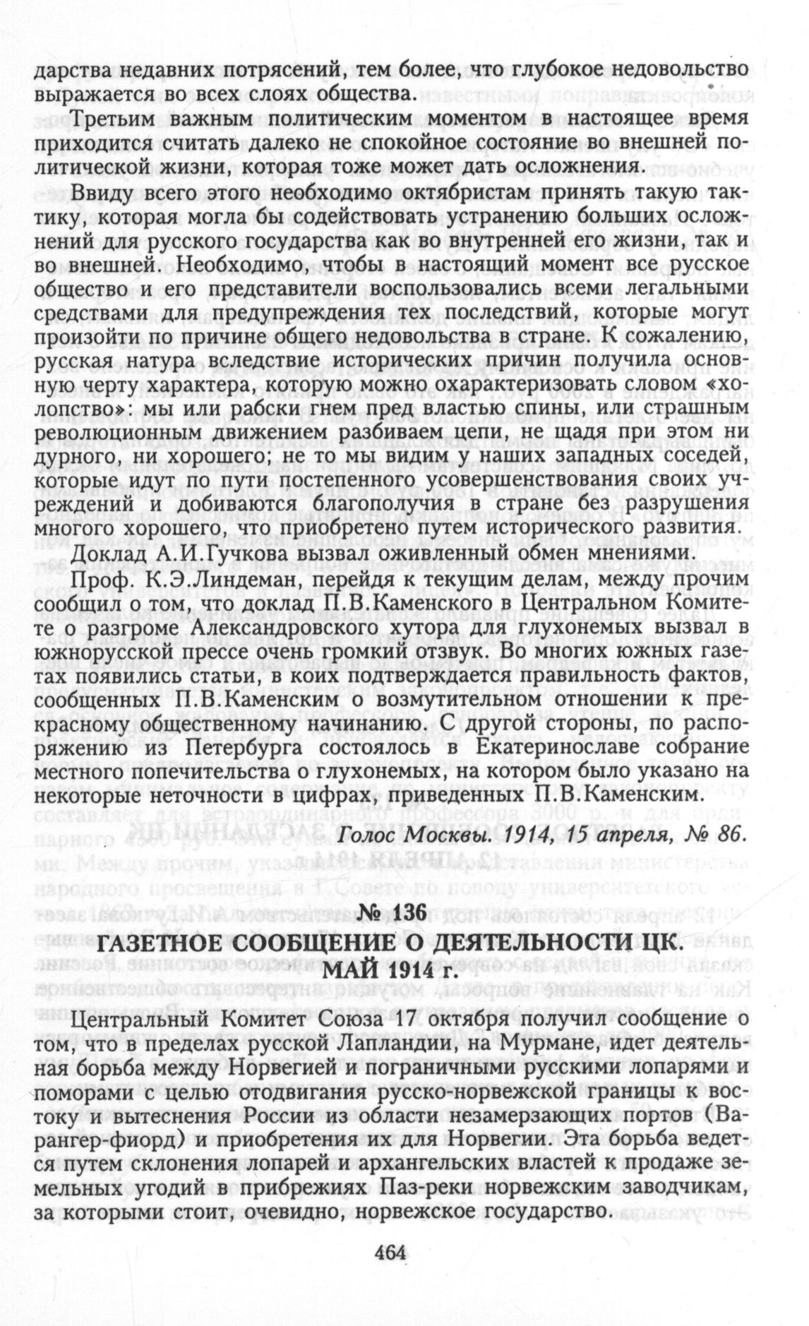 Газетное сообщение о деятельности ЦК. Май 1914 г. // Голос Москвы. 1914, 6 июня, № 129.