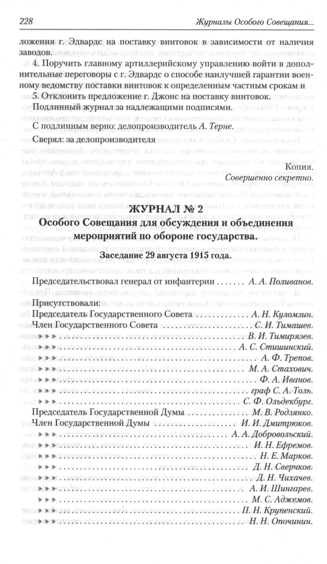 Журнал № 2 Особого Совещания для обсуждения и объединения мероприятий по обороне государства. Заседание 29 августа 1915 года