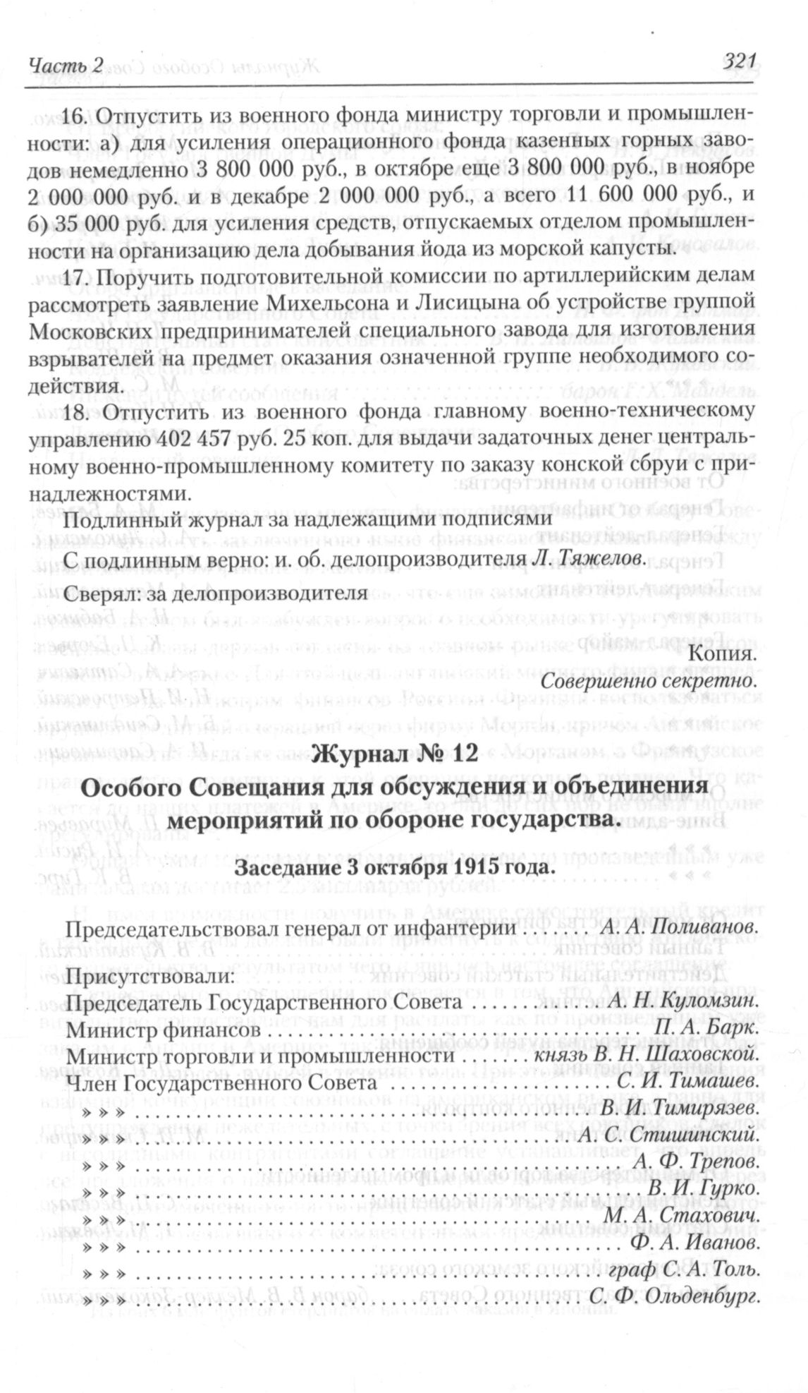 Журнал № 12 Особого Совещания для обсуждения и объединения мероприятий по обороне государства. Заседание 2 октября 1915 года