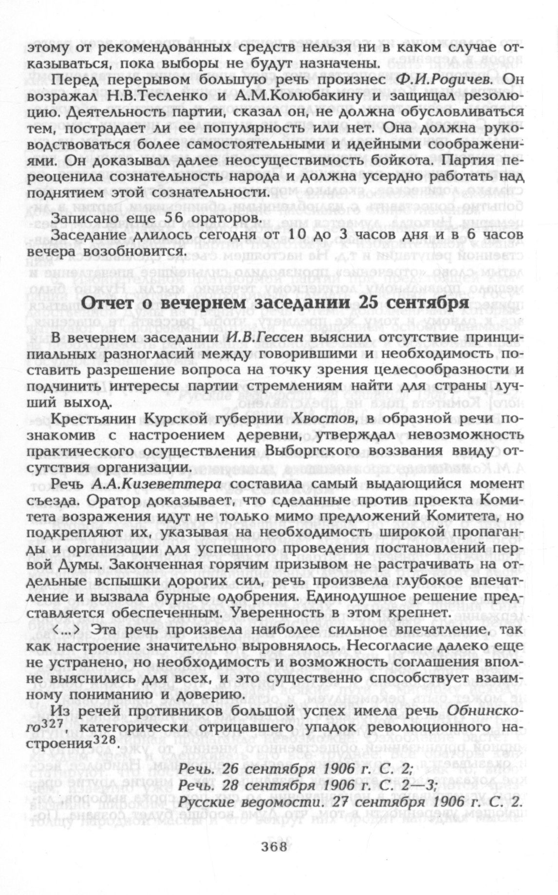 Четвертый съезд конституционно-демократической партии. 24-28 сентября 1906 года. Отчет о вечернем заседании 25 сентября // Речь. 26 сентября 1906 г. С. 2.; Речь. 28 сентября 1906 г. С. 2—3.; Русские ведомости. 27 сентября 1906 г. С. 2.