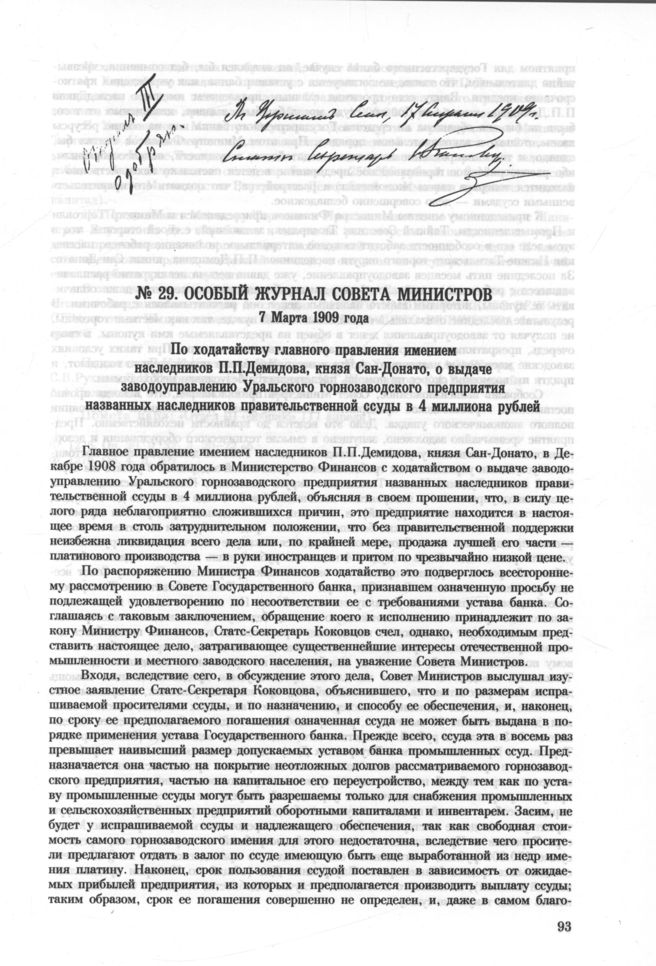 Особый журнал совета министров. 7 Марта 1909 года. По ходатайству главного правления имением наследников П.П.Демидова, князя Сан-Донато, о выдаче заводоуправлению Уральского горнозаводского предприятия названных наследников правительственной ссуды в 4 миллиона рублей