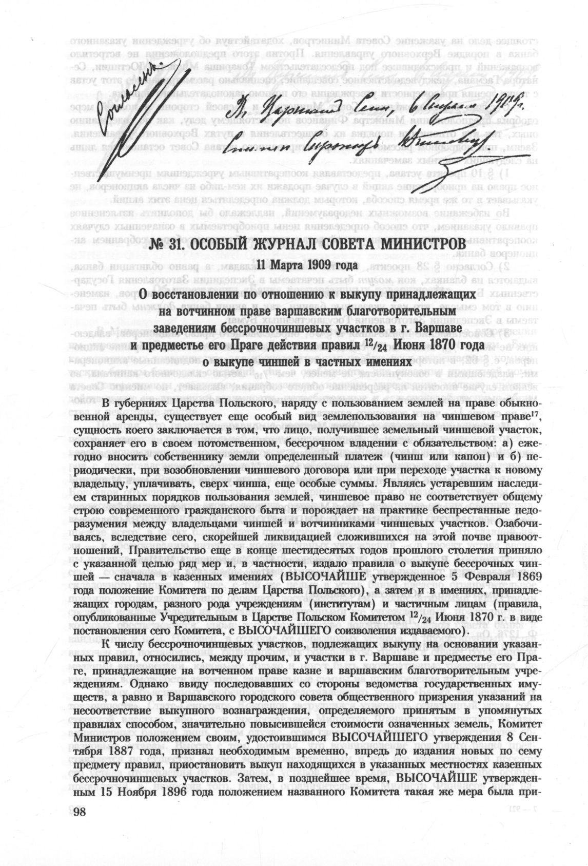 Особый журнал совета министров. 11 Марта 1909 года. О восстановлении по отношению к выкупу принадлежащих на вотчинном праве варшавским благотворительным заведениям бессрочночиншевых участков в г. Варшаве и предместье его Праге действия правил 12 / 24 Июня 1870 года о выкупе чиншей в частных имениях