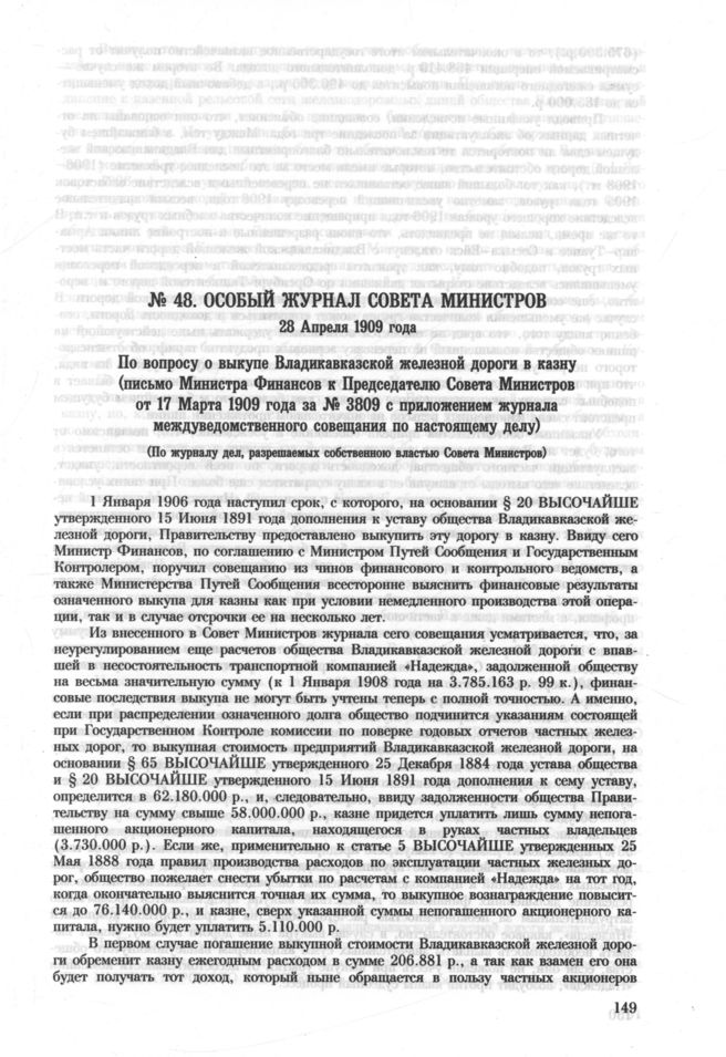 Особый журнал совета министров. 28 Апреля 1909 года. По вопросу о выкупе Владикавказской железной дороги в казну (письмо Министра Финансов к Председателю Совета Министров от 17 Марта 1909 года за № 3809 с приложением журнала междуведомственного совещания по настоящему делу)