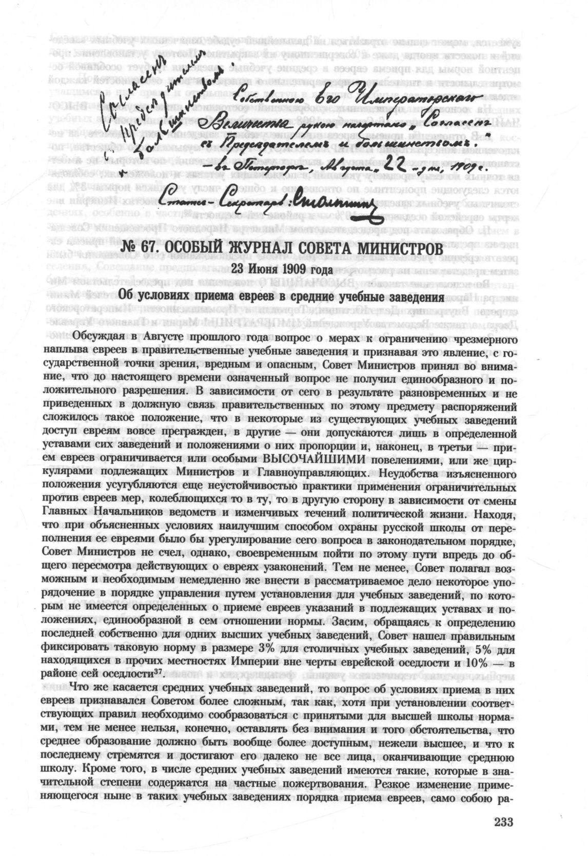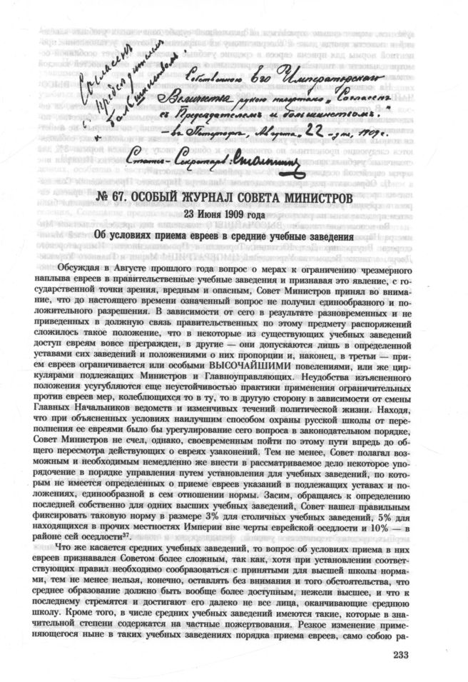 Особый журнал совета министров. 23 Июня 1909 года. Об условиях приема евреев в средние учебные заведения // РГИА Ф. 1276. Оп. 20. Д. 35. Л. 86-94 об.; Ф. 1276. Оп. 3. Д. 835; Ф. 1276. Оп. 5. Д. 7. Д. 162. Л. 4-5 об., 8-13, 20; ПСЗ III. Т. XXIX; № 32501; СУ. 22 сентября 1909 г. Отд. I. Ст. 1874.