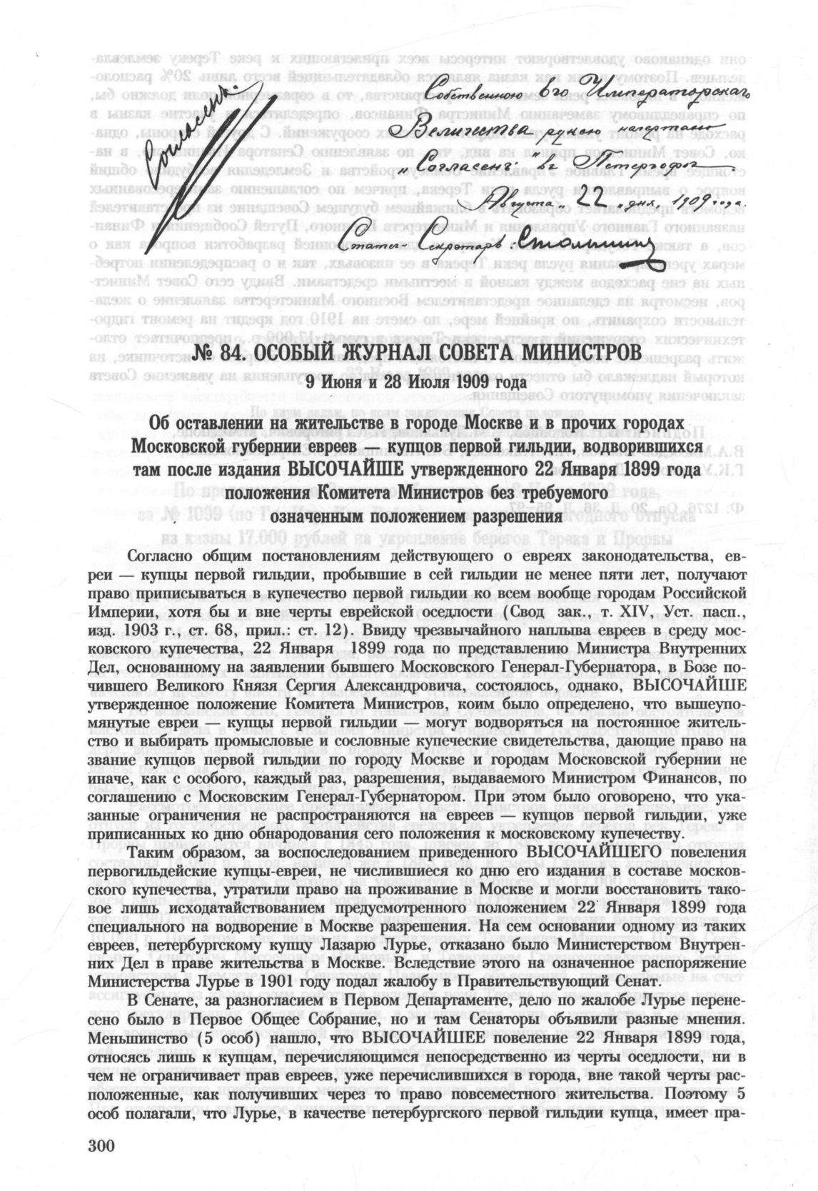 Особый журнал совета министров. 9 Июня и 28 Июля 1909 года. Об оставлении на жительстве в городе Москве и в прочих городах Московской губернии евреев — купцов первой гильдии, водворившихся там после издания Высочайше утвержденного 22 Января 1899 года положения Комитета Министров без требуемого означенным положением разрешения
