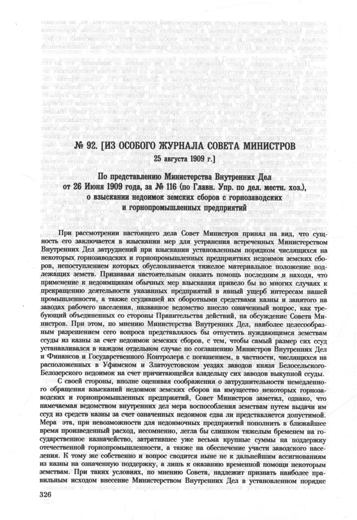 Особый журнал совета министров. 25 Августа 1909 года. По представлению Министерства Внутренних Дел от 26 Июня 1909 года, за № 116 (по Главн. Упр. по дел. местн. хоз.), о взыскании недоимок земских сборов с горнозаводских и горнопромышленных предпр...