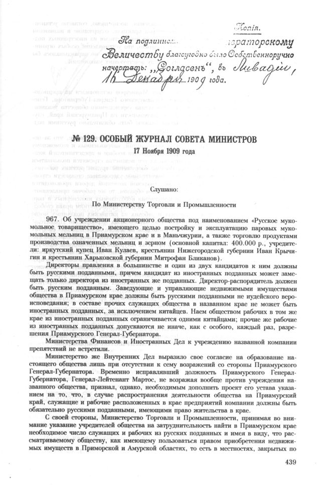 Особый журнал совета министров. 17 Ноября 1909 года. По Министерству Торговли и Промышленности // РГИА Ф. 1276. Оп. 25. Д. 24. Л. 415-417.