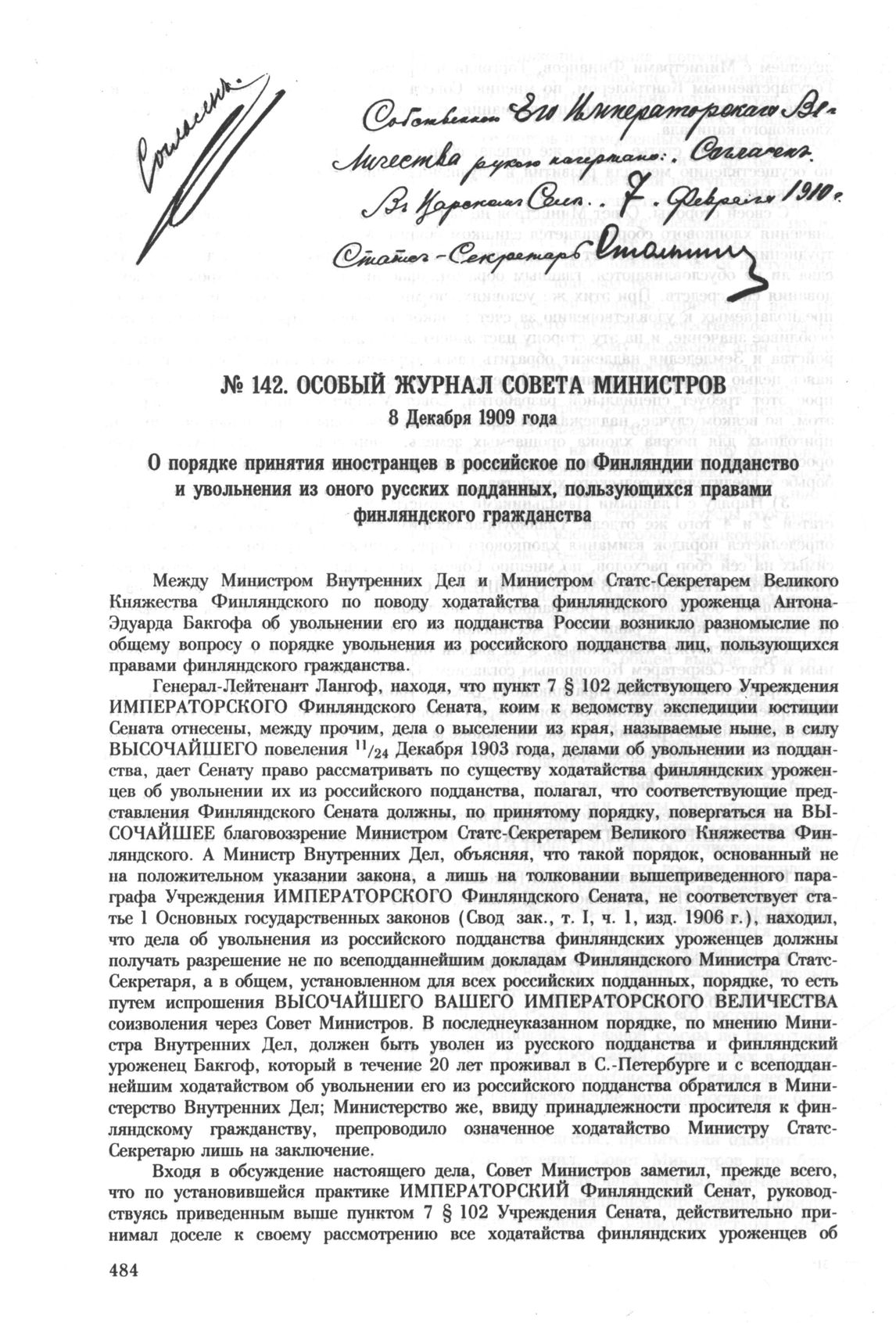Особый журнал совета министров. 8 Декабря 1909 года. О порядке принятия иностранцев в российское по Финляндии подданство и увольнения из оного русских подданных, пользующихся правами финляндского гражданства