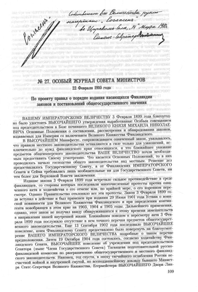Особый журнал совета министров. 22 Февраля 1910 года. По проекту правил о порядке издания касающихся Финляндии законов и постановлений общегосударственного значения // РГИА Ф. 1276. Оп. 20. Д. 42. Л. 113-136 об.; Ф. 1276. Оп. 6. Д. 27. ПСЗ III. Т. XXX. № 33200; СУ. 14 марта 1910. Отд. I. Ст. 399.